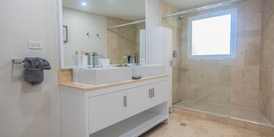 There are 3 full bathrooms with standup showers. The 1st and 2nd bathroom are each located in the master bedrooms and the 3rd bathroom is located across the hall from bedroom #3. Hairdryer included.