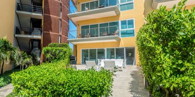 This is a corner unit with its own private patio. The patio has a dining table and an outdoor seating area. Beach chairs, beach wagon and cooler are provided.